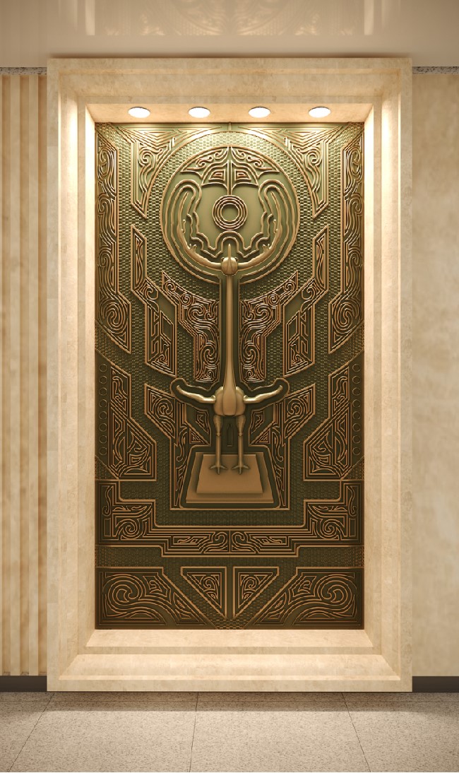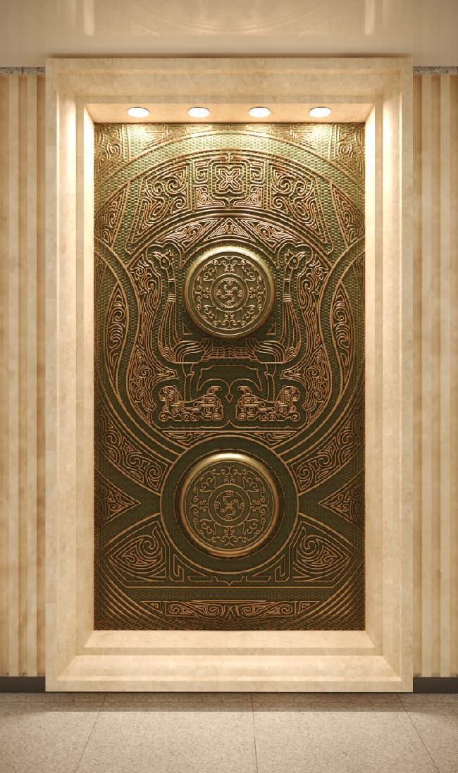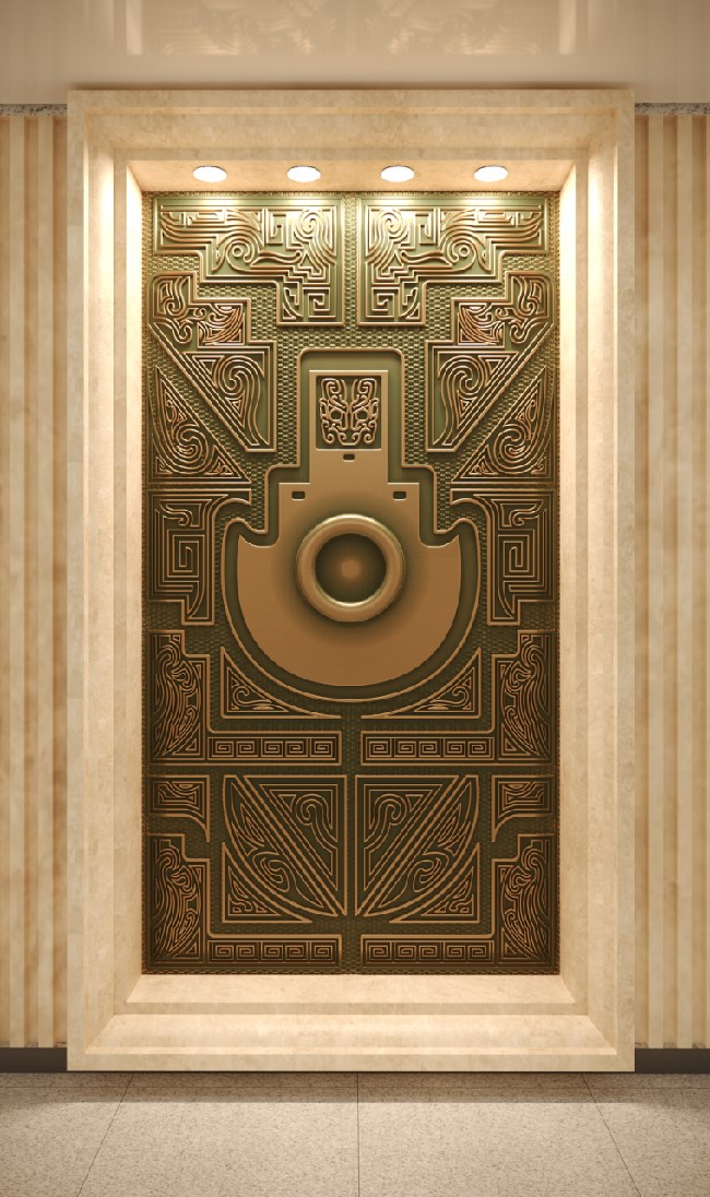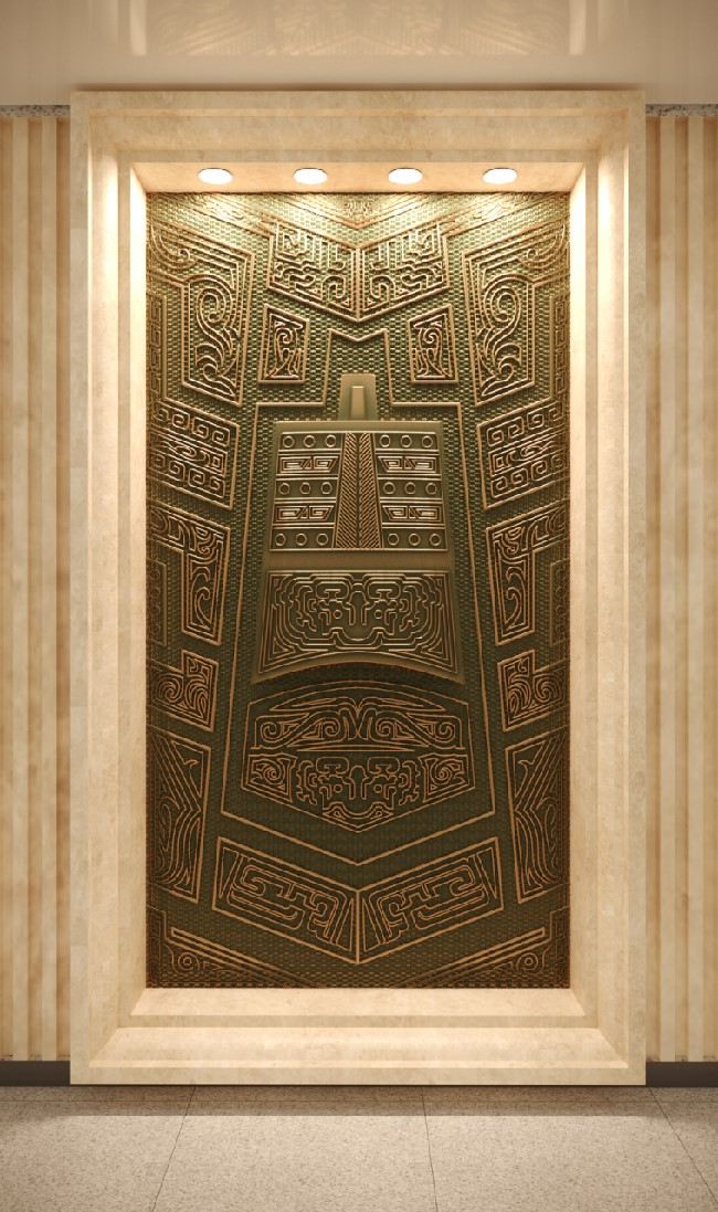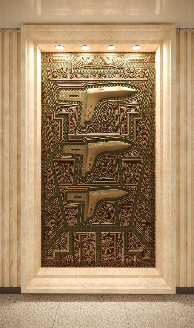 在楚文化中,常常有一系列神秘浪漫的意象组合,如鹿角立鹤、虎座凤鸟、龙蟠凤逸等,都体现了楚文化中“独与天地精神往来”的特质,给人以自由、生动的想象。该方案正是结合楚文化意象组合自由生动的特点,将博物馆具有代表性的文物(乐器、兵器、礼器)与楚纹饰进行解构、组合而形成新的形式。纹饰随着文物外形展开,随形而走,形成新的框架画面对文物进行衬托。柱子和墙面上的纹饰相得益彰,使整个环境融为一体。