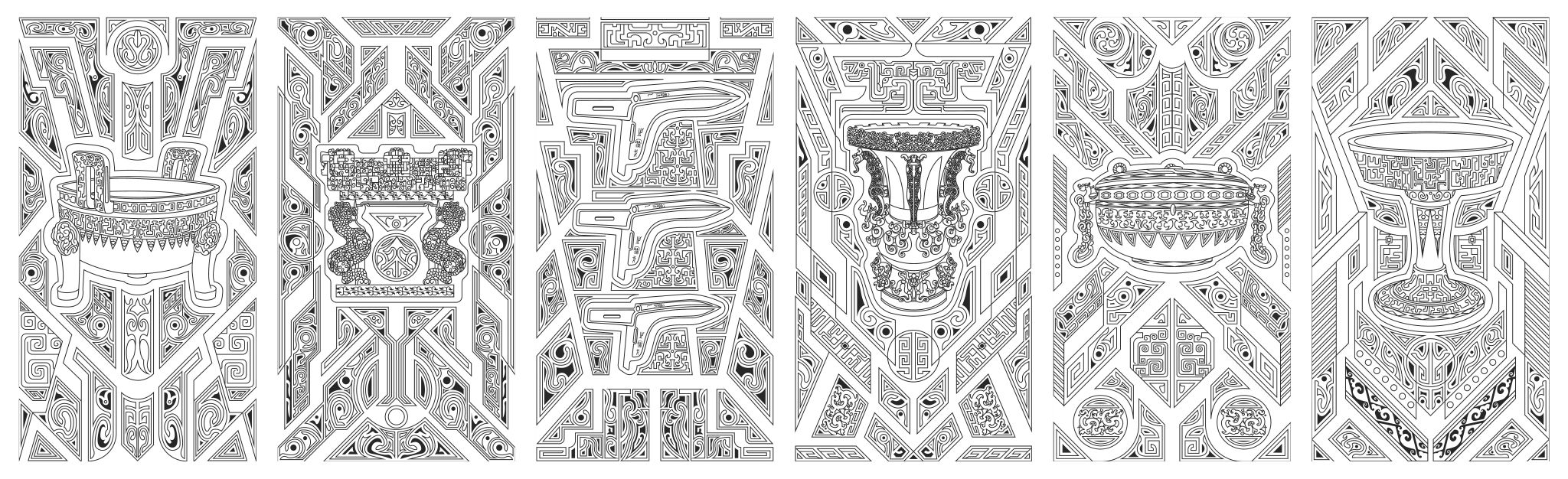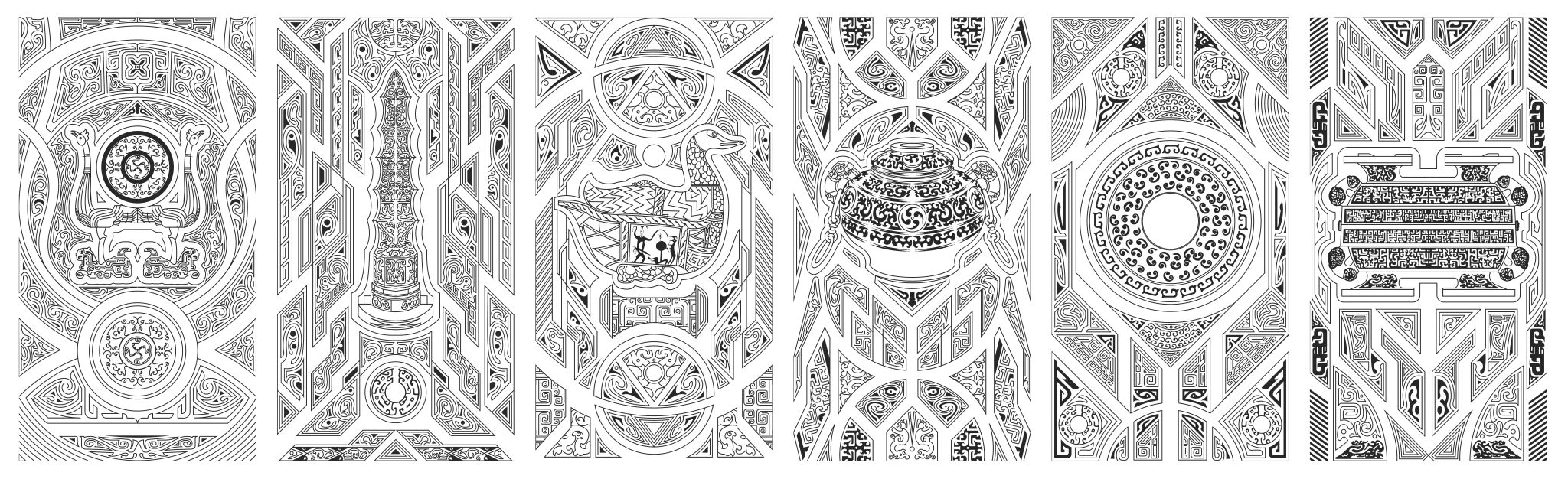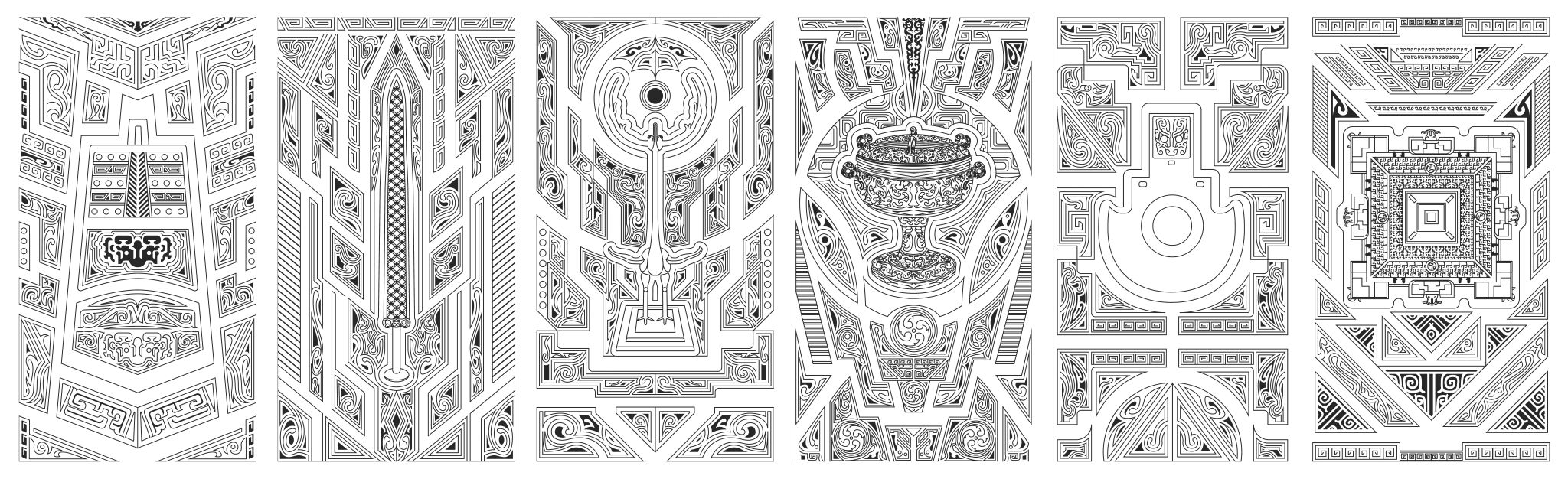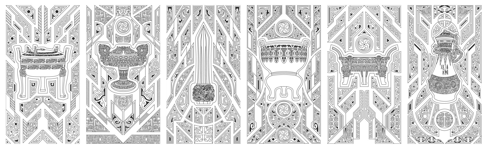 在楚文化中,常常有一系列神秘浪漫的意象组合,如鹿角立鹤、虎座凤鸟、龙蟠凤逸等,都体现了楚文化中“独与天地精神往来”的特质,给人以自由、生动的想象。该方案正是结合楚文化意象组合自由生动的特点,将博物馆具有代表性的文物(乐器、兵器、礼器)与楚纹饰进行解构、组合而形成新的形式。纹饰随着文物外形展开,随形而走,形成新的框架画面对文物进行衬托。柱子和墙面上的纹饰相得益彰,使整个环境融为一体。